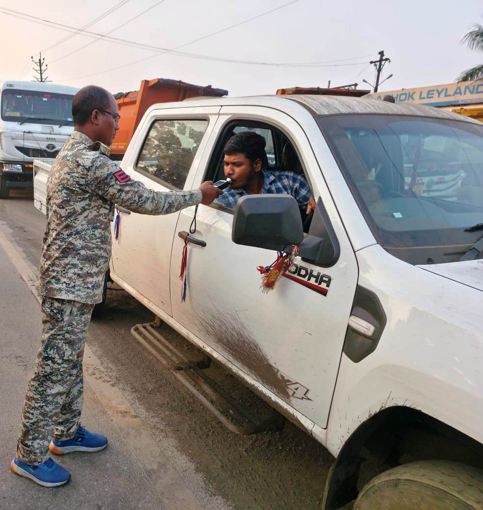 रायगढ़, 15 अक्टूबर । एसपी श्री दिव्यांग कुमार पटेल के दिशा निर्देशन एवं एडिशनल एसपी श्री आकाश मरकाम, डीएसपी ट्रैफिक श्री उत्तम प्रताप सिंह के मार्गदर्शन में कल दिनांक 14 अक्टूबर 2025 को जिले के सभी थाना क्षेत्रों में शराब पीकर वाहन चलाने वालों के विरुद्ध विशेष अभियान चलाया गया। अभियान के दौरान विभिन्न थानाक्षेत्रों में कुल 37 व्यक्तियों के विरुद्ध मोटर व्हीकल एक्ट की धारा 185 के तहत कार्रवाई की गई। इनमें कोतरारोड पुलिस ने सर्वाधिक 7 वाहन चालकों को पकड़ा है। सभी के विरुद्ध इस्तगाशा तैयार कर न्यायालय में पेश किए जाने की कार्यवाही की जा रही है। विदित हो कि मोटर व्हीकल एक्ट की धारा 185 के तहत शराब पीकर वाहन चलाने पर पहली बार पकड़े जाने पर 6 माह तक की कैद या ₹10,000 तक का जुर्माना या दोनों हो सकते हैं, जबकि दूसरी बार अपराध करने पर सजा और जुर्माने में वृद्धि का प्रावधान है। डीएसपी ट्रैफिक श्री उत्तम प्रताप सिंह ने बताया कि आगामी त्यौहारी सीजन को देखते हुए पुलिस द्वारा शहर और तहसील स्तर पर प्रतिदिन जांच अभियान जारी रहेगा। एसपी श्री दिव्यांग कुमार पटेल द्वारा तेज रफ्तार, मॉडिफाई साइलेंसर और नशे में वाहन चलाने वालों पर विशेष निगरानी रखने और कठोर कार्रवाई के निर्देश दिए गए हैं, जिसके तहत पुलिस की यह मुहिम लगातार जारी रहेगी।