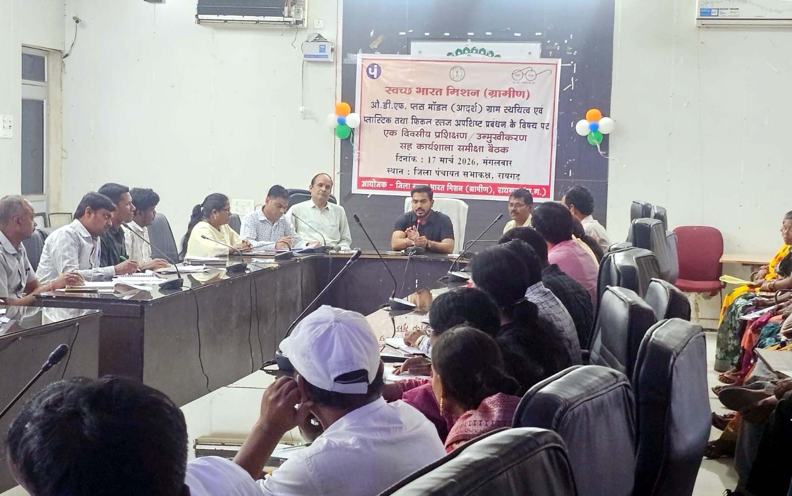 रायगढ़, 18 मार्च 2026/ स्वच्छ भारत मिशन (ग्रामीण) अंतर्गत ओडीएफ प्लस मॉडल (आदर्श) ग्राम स्थायित्व एवं प्लास्टिक तथा फिकल स्लज अपशिष्ट प्रबंधन के विषय पर एक दिवसीय प्रशिक्षण/उन्मुखीकरण सह कार्यशाला का आयोजन जिला पंचायत के सभाकक्ष में किया गया। सीईओ जिला पंचायत श्री अभिजीत बबन पठारे की अध्यक्षता में आयोजित कार्यशाला में जिले के सभी 07 जनपद पंचायतों से 10-10 सरपंच, स्वच्छाग्रही समूह, सचिव, बीएसओ, बीसी, सीसी, सहायक परियोजना अधिकारी, जिला स्तरीय मास्टर ट्रेनर, जिला सलाहकार एवं एसबीएमजी टीम के सदस्य उपस्थित रहे। सभी प्रतिभागियों को स्वच्छता से जुड़े विभिन्न पहलुओं पर विस्तार से जानकारी दी गई और उनके दायित्वों को स्पष्ट किया गया।